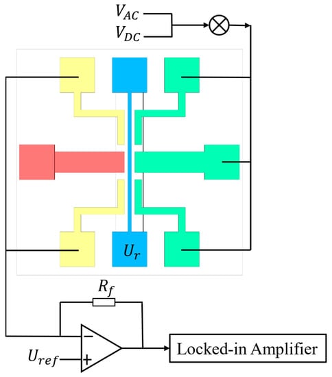 In this paper, the resonator is driven by electrostatic driving, and the driving signal is a mixed signal of AC and DC. Capacitance detection is adopted to detect the vibration of the resonator. Due to the vibration of the resonator, the capacitance between the resonator and the detection electrode changes, and the induced current is generated at the detection electrode under the condition of a fixed voltage between the resonator and the detection electrode. A transimpedance amplifier is used to convert the induced current into a voltage signal, and the voltage signal is detected by a lock-in amplifier eventually. A schematic view of the driving and detection system is shown in Figure 2.