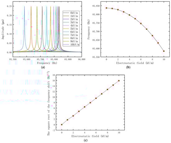 The theoretical calculation results of electrostatic field sensor. (a) The theoretical amplitude–frequency characteristic curves of the electrostatic field sensor under different electrostatic field intensities; (b) the theoretical frequency shift of the electrostatic field sensor; (c) the linearized theoretical output of the electrostatic field sensor.