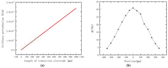 The optimization of the transition electrode by finite element simulation. (a) The stiffness perturbation versus the length of the transition electrode, where the length of the transition electrode represents the area of the transition electrode facing the resonator, due to the constant thickness of the SOI device layer; (b) the relationship between the frequency shift of the resonator and the position of the transition electrode, wherein the electrostatic field is 1000 V/m, the transition electrode is , and the center of the transition electrode is at the middle of the resonator when the position equals zero.