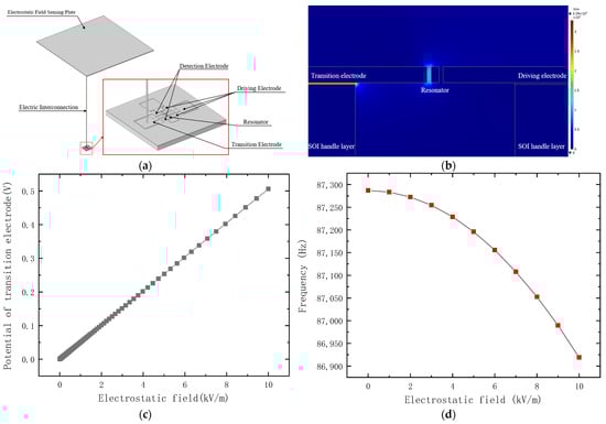 The simulation model and results of the electrostatic field sensor. (a) The finite element simulation model; (b) the electrostatic field distribution in the surroundings of the resonator under the condition of an electrostatic field of ; (c) the relationship between the potential of the transition electrode and electrostatic field, due to the induction charge concentration; (d) the simulated frequency shift of the electrostatic field sensor; (e) the simulated linearized output of the electrostatic field sensor.