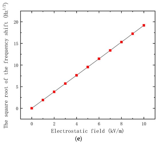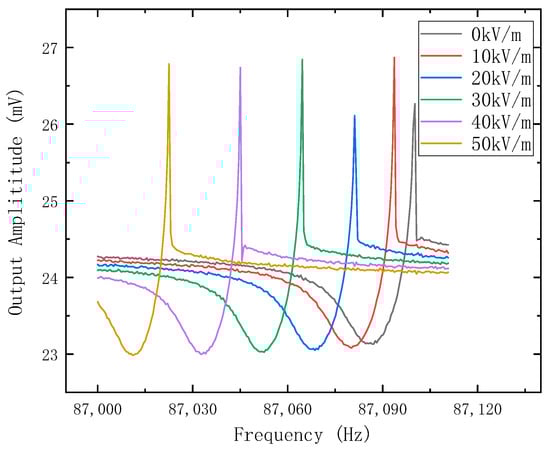 To improve the charge transfer coefficient and avoid the nonlinearity of the output signal, the voltage of the resonator is set to . Then, a AC driving voltage is applied to the driving electrode. The frequency response versus the electrostatic field is shown in Figure 11. Next, the resonant frequency is extracted and processed, and the response result of the output frequency versus the applied electrostatic field is shown in Figure 12.