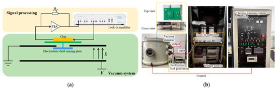 The calibration system of the electrostatic field sensor is shown in Figure 9, and it consists of two electrostatic field generation plates, a voltage source, a signal processing circuit, a lock-in amplifier, a computer, and a thermal vacuum system. The standard electrostatic field is generated by parallel plates. The gap between the two parallel plates is , and it is supported by polytetrafluoroethylene columns, and a hole with a diameter of in the center of the upper plate is created for the electrostatic field sensor. The voltage of the upper plate is zero, and the standard electrostatic field between the two plates is generated by adjusting the voltage between the two plates. The signal processing circuit mixes AC and DC driving signals for the chip and converts the output signals of the chip into voltage via a transimpedance amplifier. The signal output from the processing circuit is sent to the HF2LI lock-in amplifier for final extraction, and then it is displayed and recorded on the computer. Note that the electrostatic field sensor chip, the signal processing circuit, and the electrostatic field generation plates are placed in the vacuum chamber for testing.
