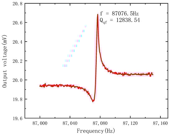 The tested amplitude–frequency response of the electrostatic field sensor is shown in Figure 10. The resonant frequency of the electrostatic field sensor is under the condition of pressure and without an electrostatic field. Compared with the simulated resonant frequency, the test result of the resonant frequency is in good accordance with the simulation result. The discrepancy is related to the fabrication process variations and the simulation deviation. The amplitude–frequency characteristic curve is asymmetrical due to the Fano resonance, which is caused by the phase difference between the vibration signal of the resonator and the feedthrough signal from the driving signal [22]. The quality factor is calculated as 12,838.54 according to the method in the literature [22].