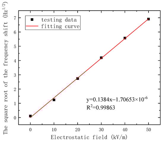 Moreover, the linearization of the output resonant frequency is introduced, as shown in Figure 13, to quantitatively analyze the linearity of the sensor. The result shows that the sensitivity of the linearization is , and the linearity is calculated as 2.49%. Compared with reported research [23], the sensitivity of the electrostatic field sensor considered in this paper has been improved by 10 times.