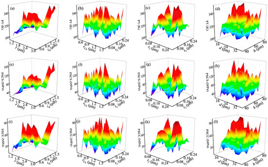 In this research, the structural parameters of the CTSV array are the radius of the copper column (r), the thickness of the dielectric layer (td), the thickness of the coaxial copper ring (rCu), the thickness of the oxide layer between the copper column and shielding layer (t1), the thickness of oxide layer between the coaxial copper ring and shielding layer (t2), the thickness of the oxide layer in the copper ring (t3), the distance between CTSV units (d), and the height of CTSV units (h). The critical indexes of the CTSV array are the peak temperature (PT), peak stress of the Chiplet-based system (PSCS), and copper column (PSCC). The range of r is [1, 3] μm. The ranges of td and rCu are [0.5, 1.5] μm. The ranges of t1, t2, and t3 are [0.05, 0.25] μm. The ranges of d and h are [15, 35] and [40, 80] μm, respectively. The design of the experiment used in this study is an orthogonal experiment. The orthogonal experiment is utilized in the finite element simulation, which includes 8-factors and 9-levels. The orthogonal experiment is shown in Table 2. The number of the FEM simulation is 81, which is obtained by the IBM SPSS Statistics software 24. In the software, the orthogonal plan can be obtained after entering the factors and levels. According to the scheme of orthogonal design, if the level is 9, the number of orthogonal experiments is 81. The simulation results of the CTSV array are shown in Figure 2, based on the orthogonal experiment. These figures are plotted by the Origin 2021 software. According to the orthogonal design, the critical indexes of the CTSV array vary with the structural parameters. The changes in PT with the structural parameters are shown in Figure 2a–d. The range of PT is [300.88, 352.06] K. From Figure 2a, it can be seen that The PT is gradually decreasing with the increase of r. The PT is first increased, then decreased, and finally increased with the increase in td. From Figure 2b,c, the PT is gradually increased and then decreased with the increase of rCu. The PT is gradually increased, then decreased with the increase of t1, t2, and t3. From Figure 2d, the PT first decreases with the increase of d and then gradually increases with the increase in h. The changes in PSCS and PSCC with the structural parameters are shown in Figure 2e–l. The ranges of PSCS and PSCC are [21.05, 176.74] and [13.30, 97.30] MPa, respectively. From Figure 2e,i, it can be seen that the PSCS and PSCC are first increased and then decreased with the increase of r. The PSCS and PSCC are first increased, then decreased, and gradually increased with the increase in td. From Figure 2f,g,j,k, the PSCS and PSCC are increased and then decreased with the increase of rCu. The PSCS and PSCC are gradually increasing with the decrease in t1, t2, and t3. From Figure 2h,l, it can be seen that the PSCS and PSCC are increased with the decrease of d. The PSCS and PSCC decrease with the increase in h. Due to the fact that these eight structural parameters collectively affect the critical index, the above analysis is only a discussion of the approximate variation of the critical indexes with the structural parameters. Undoubtedly, the thermal and stress distributions vary with the structural parameters, and the relationship between the structural parameters and critical indexes of the CTSV array is complex and irregular.