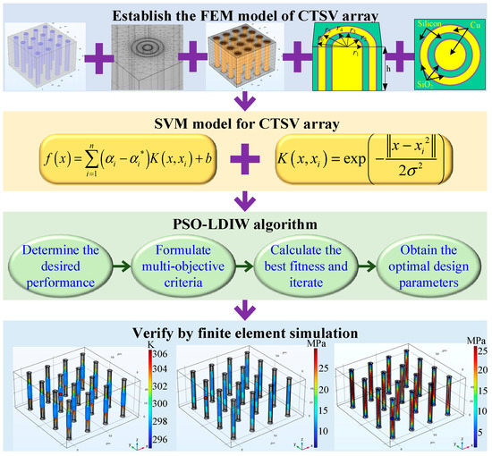 The FEM has the advantages of high computational accuracy, good mesh adaptability, and easy handling of irregular geometric areas, but its disadvantages are that it is time-consuming and inefficient for large-scale simulation [26]. In recent years, data-driven models, such as the support vector machine (SVM) model, neural networks, machine learning, etc., have been applied in medicine, information, industry, etc. Due to their advantages in adaptivity, simplicity, fault tolerance, and robustness, neural networks have been widely used in image processing [27,28], model-predicted control [29,30] data extraction [31,32], etc. The deep neural network has been applied in large-scale integrated systems to describe complex relationships [33]. There are many regression models, such as the linear regression model, the random forest model, the SVM model, etc. Due to its high accuracy, generalization, and non-linear characterization, the SVM model has been used in complex engineering problems such as regression estimation of data, global sensitivity evaluation, and estimation of alloy flow characteristics [34,35,36,37]. The SVM model is good at dealing with linearly indivisible sample data and can effectively avoid data overfitting. In addition, the disadvantages of FEM are that it is time-consuming and inefficient for large-scale simulation, so SVM can be used to replace the FEM model to improve the simulation’s efficiency. At the same time, the particle swarm optimization algorithm with linear decreasing inertia weight (PSO-LDIW) has been widely used in the optimization of electronic components [28,38,39]. Thus, the PSO algorithm can be used to optimize the structural parameters of the CTSV array to design a Chiplet-based system with high thermal stress performance.