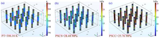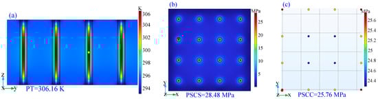 In addition, the critical indexes of the thermal-stress coupling CTSV array model are the PT, PSCS, and PSCC. The multi-objective evaluation function F has been constructed: