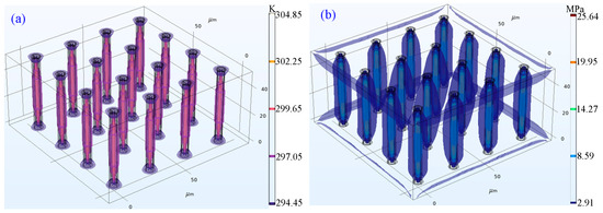 In this research, the efficient thermal-stress coupling design method of CTSV arrays is applied to optimize the structural parameters of CTSV arrays. According to the optimization algorithm, the optimized r, td, rCu, t1, t2, t3, d, and h are 1, 1.25, 0.64, 0.22, 0.08, 0.15, 28.19, and 53.92 μm, respectively. The simulation results of the FEM model at the optimized structural parameters are shown in Figure 5. The contour surfaces of temperature and stress of the verified results are shown in Figure 6. Clearly, the temperature is higher in the center of the CTSV unit, and the stress distribution is distorted at the interface of different materials. The verified PT, PSCS, and PSCC are 306.16 K, 28.48 MPa, and 25.76 MPa, respectively, while the desired targets are 310 K, 30 MPa, and 25 MPa. Obviously, the verified results agree well with the desired targets. This is because the established SVM model can accurately characterize the FEM model of the CTSV array applied in a Chiplet-based system.