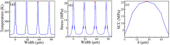In addition, two 2D cross-sections are established to analyze the thermal and stress distribution of the CTSV array. The simulation results are shown in Figure 7. From Figure 7a, the cross-section is x = 28.297 μm. Obviously, the temperature is higher in the center, and the trend of temperature is decreasing from the center to the marginal region. From Figure 7b,c, the cross-section is z = 26.96 μm. The peak stress is located at the interface between different materials. This is because a mismatch in the coefficient of thermal expansion exists between different materials. Moreover, three lines are established to analyze the critical index distribution on the cross section. The simulation results are shown in Figure 8. The temperature curves of the horizontal line (from point (28.297, −14.095, 26.96) to point (28.297, 98.665, 26.96)) are presented in Figure 8a. Clearly, the temperature gradually increases from the edge to the center of the copper column. The stress curves of the horizontal line (from point (0, −14.095, 26.96) to point (0, 98.665, 26.96)) and vertical line (from point (−0.233, −0.287, 0) to point (−0.233, −0.287, 53.92)) are presented in Figure 8b,c. Due to the mismatch of coefficients of thermal expansion between different materials, the stress distribution is buried at the interface of different materials, and the PSCC is located at approximately h/2.