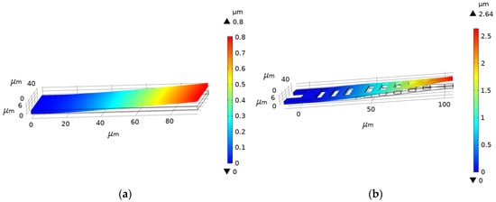 To verify that the optimized upper electrode structure is easy to pull down, the COMSOL software was used to apply equivalent pressure to both upper electrode structures, and the simulation results are shown in Figure 2. The displacement of the straight upper electrode is 0.8 μm, and that of the displacement of the triangular upper electrode is 2.64 μm. The results show that the triangular upper electrode structure is easier to pull down than the straight one. Using the above equations, the equivalent elastic coefficient of the cantilever beam was calculated to be 5.32 N/m, and the driving voltage of the triangular upper electrode was 13 v.