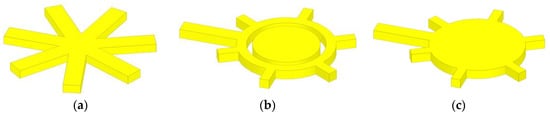 The function of the power divider (power splitter) is to proportionally distribute the input signal into the end branches [], and its performance has an important impact on the performance of the SP6T RF MEMS switch in terms of insertion loss and signal splitting. The design expects to design a power divider structure to make the RF performance of each port of the SP6T RF MEMS switch consistent, so three power divider design models are proposed in this paper, as shown in Figure 4. Figure 4a is a general six-out-of-one power divider, whose structure is designed to divide into six branches of 100 μm length directly at the signal shunt. Figure 4b is a circular power divider, whose structure is designed to connect a 10 μm wide ring at the signal shunt and set a 75 μm block in the center of the circle as a ground wire. Figure 4c shows the disc-type power divider, whose structure is designed to set a 100 μm radius disc at the signal shunt.