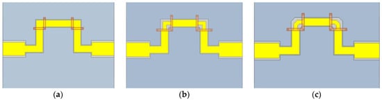 c is the free-space velocity; εeff is the relative permittivity of the CPW equivalent; f is the operating frequency of the delay; ld is the delay transmission line length; lr is the reference line length. Equation (3) shows that the amount of delay is proportional to the length of the transmission line. To reasonably use the limited area of the substrate at the same time, as often as possible to achieve a larger delay, here is the use of zigzag microstrip line wiring, as shown in Figure 7a. Due to the CPW discontinuity at the corner, it is very easy to produce slot line mode, which is usually suppressed by erecting an air bridge to connect the ground lines on both sides [].