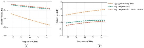 To further reduce the transmission loss, the geometric structure at the corner of the microstrip line is optimally designed in this paper. As shown in Figure 7b,c, the step compensation design and step compensation tangent design are carried out at the corners, respectively.