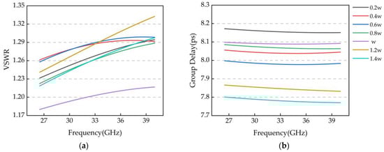 For the corner-cutting design, there is an effect of the corner-cutting width d on the transmission characteristics of the zigzag microstrip line. The simulation results of the RF performance of the zigzag microstrip line with different cut-angle widths are shown in Figure 9, where w = 30 μm is the corner transmission line width. From Figure 9, it can be seen that different corner-cutting methods have a considerable impact on the standing wave and delay of the microstrip line. From the simulation results, with the increase of the length of the corner-cutting line (d = 0.2–1.4 W), the delay performance of the transmission line deteriorates progressively, and the amount of the delay decreases by nearly 0.39 ps; at the same time, the VSWR obtained when the length of the corner-cutting line is d = w is the best, and it is optimized by 0.12 relative to that of d = 0.2 w. Therefore, as a compromise, the width of the tangent angle with d = w is chosen.