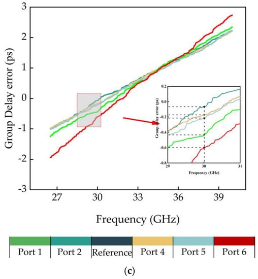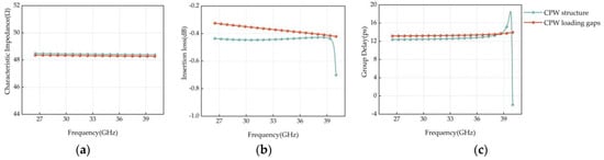 The RF performance simulations of the normal CPW structure and the loaded U-shaped slit CPW structure were performed using ANSOFT HFSS software, and the comparison results are shown in Figure 12. As shown in Figure 12a, the characteristic impedance of the CPW center guide is simulated before and after loading the U-shaped slit, and the result is that the introduction of the surface U-shaped slit has a small impact on the characteristic impedance of the transmission line, which only changes 0.11 Ω at 40 GHz. As the characteristic impedance of RF devices is generally 50 Ω, the final determination of the model signal input and output port width is 120 μm, the center guide and both sides of the ground spacing is 16 μm. As can be seen in Figure 12b,c, the RF performance of the common CPW structure deteriorates sharply at the high operating frequency band of 39.78 GHz. Comparatively, the CPW-loaded U-shaped slit outperforms the normal CPW structure in terms of insertion loss performance and delay performance in the full frequency band 26.5–40 GHz. In terms of insertion loss performance, the CPW-loaded U-shaped slit structure reduces 0.22 dB on average over the full frequency band. In terms of delay performance, the CPW-loaded U-shaped slit structure not only increases the delay by an average of 0.78 ps in the whole frequency band but also provides better delay flatness. In summary, the CPW load gap not only does not have a greater impact on the characteristic impedance of the transmission structure but also reduces the insertion loss, improves the delay amount and delay flatness, and is more suitable for the delay transmission structure in this paper.