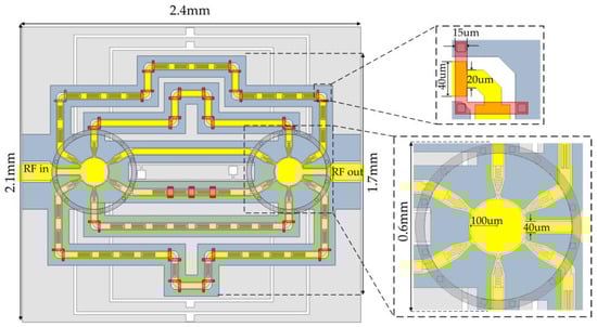 The SP6T RF MEMS switch obtained by integrating the single-throw switch and the disc power divider is shown in Figure 6. The overall size of the switch is less than 0.6 mm × 0.6 mm, and the insertion loss of each port is less than 0.62 dB in Ka-band, with excellent overall RF performance.