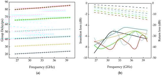 Determined by the above structure design, a five-bit MEMS delayer for an integrated modeling simulation model is shown in Figure 13, with an overall size of 2.1 mm × 2.4 mm × 0.5 mm. The model delay center frequency is 30 GHz, and the simulation results of the RF performance are shown in Figure 14 and Table 1. The simulation results of the five-bit MEMS delayers show that the error of the delay amount at the center frequency of 30 GHz is less than 0.63 ps, and the return loss is better than 28 dB. In the whole operating band (26.5–40 GHz), the delay error of all states is within 22.2%, the return rejection is better than 21.54 dB, and the insertion loss is less than 3.69 dB. The results show that the overall performance of the device is superior, although the delay accuracy and delay error increase with the increase of delay amount when each delay unit works individually in the five-bit MEMS delay.
