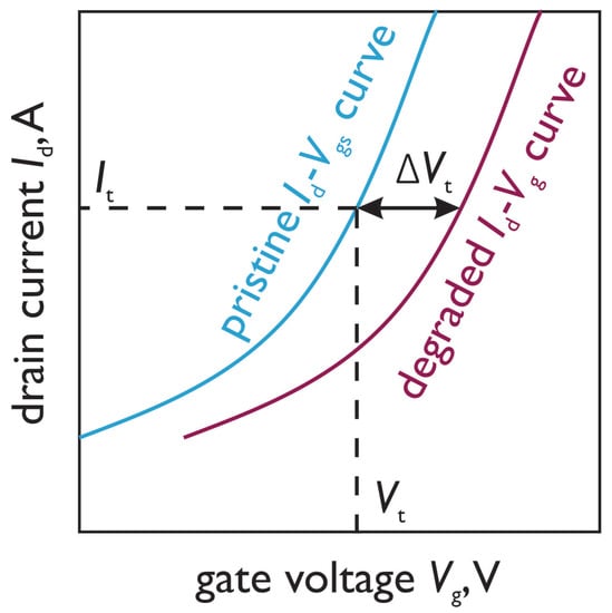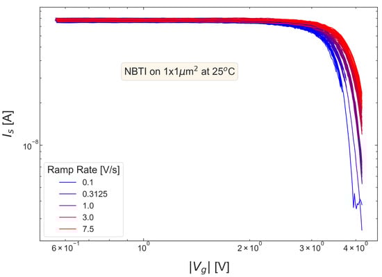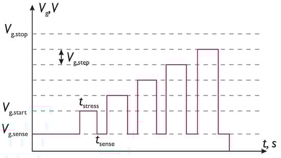 is determined as the gate voltage which satisfies the criterion: = ; see Figure 2. The obtained value is , with t being the cumulative stress time: . Therefore, the stress-induced shift in the threshold voltage is determined as = ||. Another important parameter of the RVS routine is the ramp rate . It is noteworthy that a lower , ceteris paribus, results in a larger . This is because the stress time at each voltage step is longer for the slower ramp rate (i.e., if the value is constant and is longer, then their ratio , defined as , is lower). For each value and type of MOSFETs (i.e., n- and p-channels and the fabrication process flow) we used eight samples.