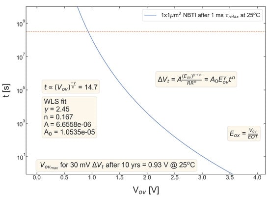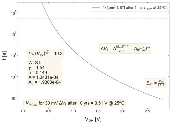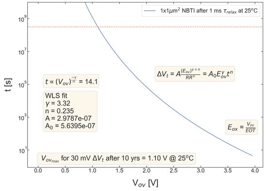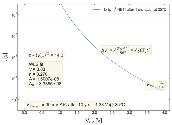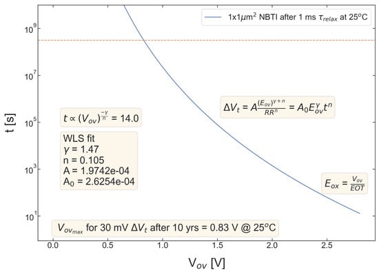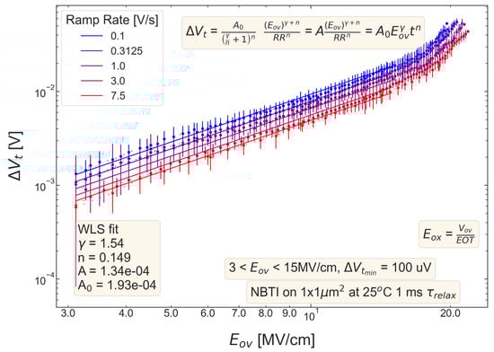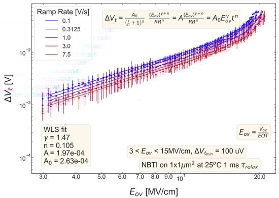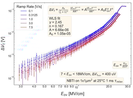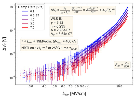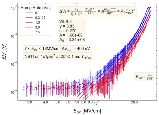where is a prefactor (accounting for the thermal activation of the BTI process), is the EOT of the gate dielectric layer, is the overdrive voltage, , while n and are exponents determining time dependency and field acceleration of BTI, respectively. According to Kerber et al. [51,52], this formula can be rewritten in a manner to link to the ramp rate :