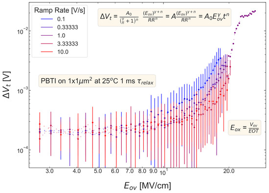For all five pMOSFETs subjected to NBTI, dependencies of the threshold voltage shift on are shown in Figure 4, Figure 5, Figure 6, Figure 7 and Figure 8. changes are mean values obtained by averaging over the entire ensemble of eight curves measured at a given rate. In Figure 4, Figure 5, Figure 6, Figure 7 and Figure 8, the error bars for threshold voltage changes are also shown; we conclude that although standard deviations of values are discernible, they are small. One can observe that values become larger at lower ramp rates and this trend agrees with Equation (2). Another pronounced peculiarity is that at high electric fields of MV/cm, the slope of dependencies increases; this behavior is typical for all considered samples. Such a peculiarity is most probably related to non-equilibrium BTI driven by electrons traveling in the SiON conduction band, which can gain substantially high energies due to acceleration by the electric field and induce hydrogen release at the SiON/Si interface. Generation of interface traps according to this scenario was reported by the group from IBM [59,60] and recently by Bastos et al. [61]. However, this process occurs at very high electric fields and is related to another physical mechanism than that responsible for “conventional” BTI. Hence, we do not consider this degradation scenario while extracting device time-to-failure (TTF). It is worth mentioning that BTI measurements continued up to high values, and before reaching these voltages most of the devices broke down. During the processing of BTI data, we applied a filtering of HBD-induced current jumps; therefore, HBD events are not pronounced in Figure 4, Figure 5, Figure 6, Figure 7 and Figure 8.