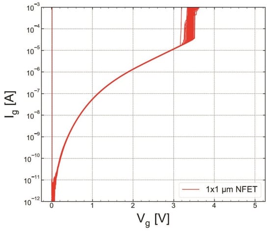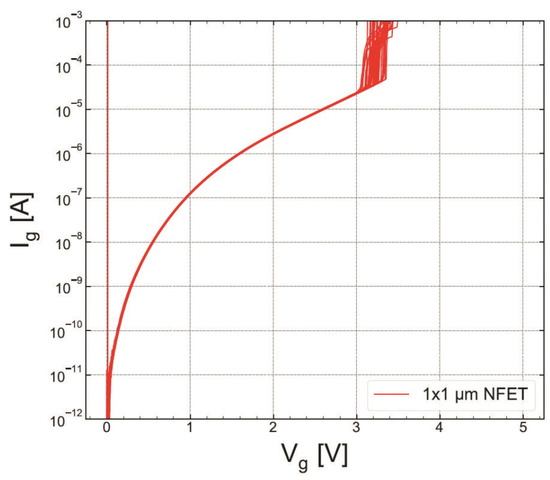 We compared HBD experimental data sets obtained only for MOSFETs with the targeted thickness of 1.9 nm fabricated by the POR (S #1) and with the SN step (S #2). Figure 15 and Figure 16 show the gate current as a function of stress gate voltage for n-channel transistors from wafers S #1 and S #2, respectively. Gate voltage values corresponding to HBD events () were extracted and binned into distributions, which are represented as Weibit plots in Figure 17. One can observe that the Weibull distribution of () extracted for the transistor fabricated by the SN process is shifted by V towards higher voltages compared to that obtained for the POR MOSFET. However, these samples have slightly different EOT values; therefore, the Weibull distribution of the breakdown field (the ratio between and EOT) shown in (Figure 18) appears to be more informative. From Figure 18, we conclude that the POR nMOSFET has lower breakdown fields compared to their counterparts fabricated with the softer nitridation step.