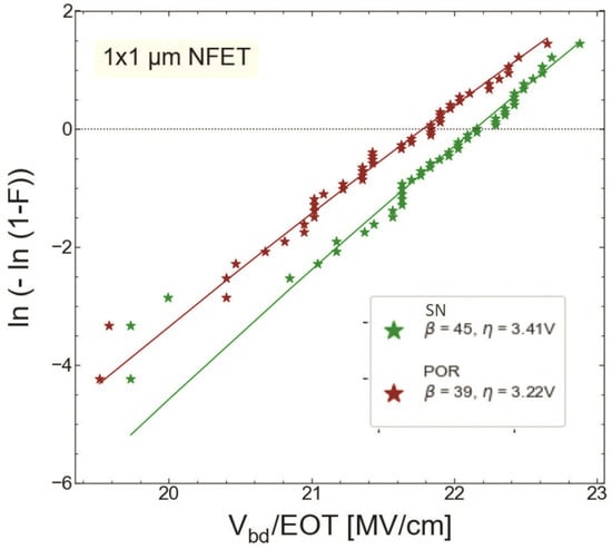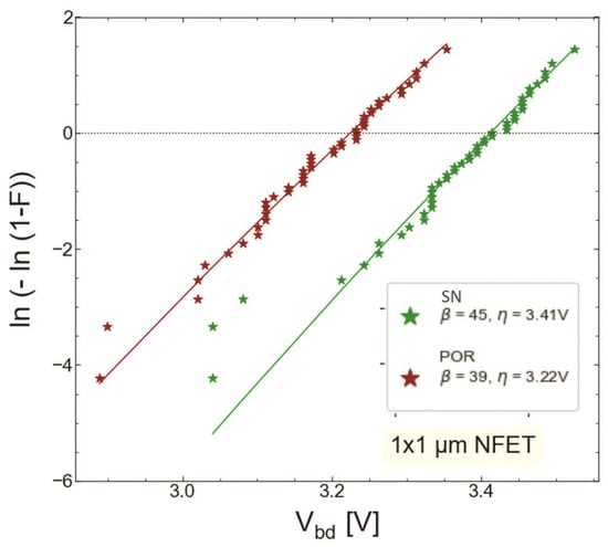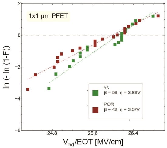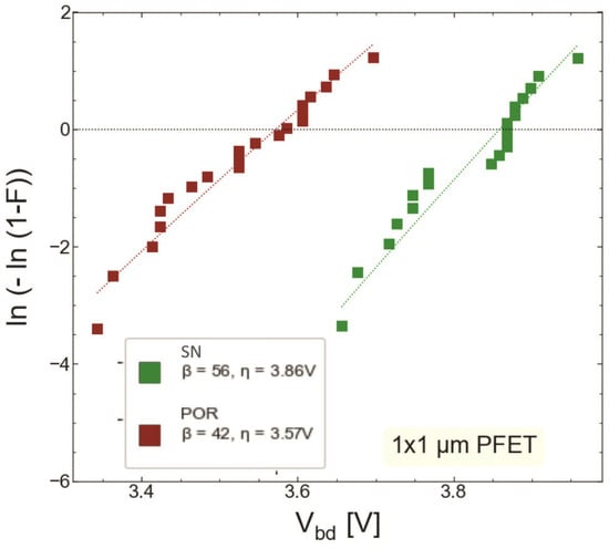 Weibit plots of breakdown voltages for the pMOSFETs fabricated by the POR (red symbols) and SN (green symbols).
