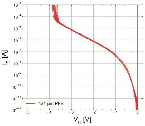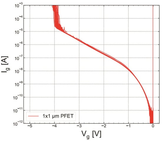 S #1 (POR), pMOSFETs: gate current as a function of stress voltage recorded during RVS HBD measurements conducted on the POR nMOSFET (sample S #1).
