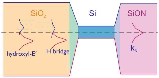 According to the current understanding of the microscopic nature of BTI in -based transistors, traps responsible for this detrimental phenomenon are the hydrogen bridges and the hydroxyl-E’ centers [63]. These traps form two bands in the band gap of : the band of acceptor-like states, which is situated in the upper half of the band gap, and the band of donor-like states in the lower half of the band gap [62,64]; see Figure 23. The centroid of the band of donor-like traps is situated below the Si valence band edge; therefore, the charge exchange between these traps and the valence band results in NBTI (and its recovery). On the other hand, the energetical levels of acceptor-like traps are close to the conduction band of Si, but their density-of-states is low; therefore, they provide a negligible contribution to PBTI (this behavior is consistent with experimental data reported in this work). As for traps responsible for BTI in SiON/SiN-based MOSFETs, they were identified as k centers with the corresponding trap density-of-states featuring a peak close to the center of the Si band gap [64,65,66,67]. As a result, they are more easily accessible for holes, thereby making the NBTI stronger in MOSFETs with SiON/SiN layers compared to their -based counterparts (under the same stress conditions). Therefore, an increasing N content in the SiON film leads to the “transition” from the hydrogen bridges and hydroxyl-E’ centers to k centers and hence more prominent NBTI. This picture is consistent with the explanation of stronger NBTI typical for SiON-based devices compared to MOSFETs with as the gate dielectric given by Reisinger et al. [35,68].