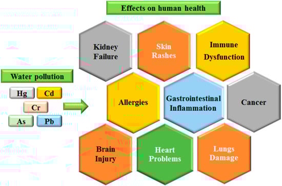 The ways through which heavy metals accumulate into the human body vary and include inhalation from the atmosphere, the ingestion of contaminated food, the drinking of contaminated water and skin contact [10]. Heavy metals are responsible for a plethora of diseases, such as cancer, diseases of the immune system, kidney failure, allergies, heart problems, neurodegenerative diseases, etc. [11,12,13,14]. In Figure 1, the severe impact of water pollution by heavy metals on human health is depicted.