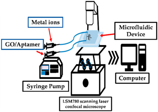 Figure 4. Schematic representation of the measurement system used for the detection of Hg2+ (0.70 ppb) and Pb2+ (0.53 ppb) inside a PDMS microfluidic device. The GO/aptamer suspension and the metal ion solutions are introduced inside the microfluidic device through the two inlets of the device using a syringe pump. The detection is achieved via the GO/aptamer suspension fluorescence intensity change, while the quenching effect is evaluated via image analysis software installed on an interfaced PC. Reproduced with permission from reference [59]. This article is an open-access article distributed under the terms and conditions of the Creative Commons Attribution (CC BY) license.