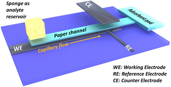 Figure 5. Illustration of a paper-based (light blue) microfluidic device with graphite foil (black) for Cd2+ and Pb2+ monitoring. The electrodes are placed on a PMMA substrate to facilitate operation. This device with the carbon-based sensor has a three-dimensional layout in which the counter and the working electrodes are facing each other and as a result the microfluidic paper channel is placed among these two electrodes. A piece of sponge is used as analyte reservoir and an absorbent pad is placed on the channel end and capillary flow is enabled. Reproduced with permission from reference [68]. This is an open-access article published under an ACS AuthorChoice License, which permits the copying and redistribution of the article or any adaptations for non-commercial purposes.