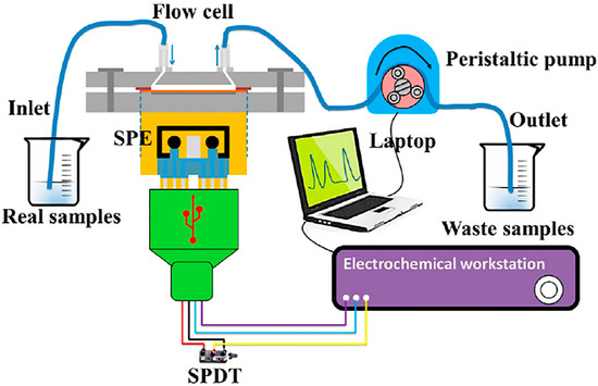Figure 9. Schematic representation of the flow injection system for various heavy metals’ detection in water, e.g., As3+, Pb2+ and Cd2+. The 3D-printed polymer flow cell with an integrated electrochemical sensor is depicted. Reproduced with permission from reference [113]. This is an open-access article distributed under the terms of the Creative Commons Attribution License (CC BY).