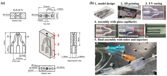 Figure 1b shows a sketch of the fabrication procedure of the droplet microfluidic device, which includes model design, 3D printing, UV curing, and microfluidics assembly with glass capillaries, tubes, and injectors. Specifically, once the model design of the microfluidic chip is completed, the model document can be uploaded to a stereolithography 3D printer (Asiga, Alexandria, Australia) with a resolution of 10 μm for the next round of printing using clear resin as the printing material. Subsequently, the printed chip is cleaned by using isopropanol and an ultrasonic washer to remove the residual resin, and then exposed to ultra-violet radiation for curing. Finally, the printed chip is assembled with glass capillaries, tubes, and injectors to obtain a complete microfluidic device allowing droplet production. To enhance optical transparency to clearly visualize the co-focusing effect, two glass capillaries with different widths can be optionally inserted into the central chip through the outlets in this work. As the magnified image shows in Figure 1b, the two glass capillaries can keep the co-axial allowing the inducement of co-flowing of the continuous-phase and dispersed-phase fluids.