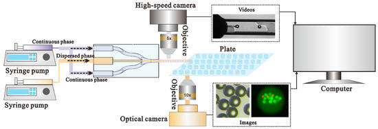 The schematics of the experimental setup are shown in Figure 2. Two syringe pumps connected with the microfluidic device imposed constant volumetric flow rates to drive the continuous-phase fluid and dispersed-phase fluid, respectively. The droplets generated from the microfluidic device were collected using a common 96-cell plate. During the experiments, to keep the droplet stable, an appropriate amount of continuous-phase liquid was added to each pore of the 96-cell plate for droplet collection. A high-speed camera (Mikrotron, Unterschleißheim, Germany) with a frequency of 1 kHz was employed to record the dynamic process of droplet generation via a 5× objective lens. Additionally, a color CMOS camera (Thorlabs, Newton, NJ, USA) was equipped on an inverted optical microscope (Olympus, Tokyo, Japan) to image the collected droplets and cells. The captured videos and images were then uploaded to a computer for further analysis. Note that, in this study, we mainly focus on the applications of a droplet microfluidic system for the generation of water-in-oil droplets; thus, mineral oil with an added surfactant was chosen as the continuous-phase liquid, and an aqueous solution such as phosphate-buffered saline (PBS) solution or a cell suspension was used as the dispersed-phase liquid.