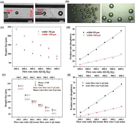Then, the quantitative analysis of droplet size and product rate measured with controlling flow rate ratios, , for each case was performed. From the result of droplet size distribution in Figure 3c, we can see that the droplet size decreases with the increasing flow rate ratio, , of the continuous phase, , and dispersed phase, , which is fixed as 2 μL/min for both cases, while for the device with a 100 μm channel, the droplets are about 1.5 times larger than those produced by the device with a 50 μm channel under the same flow rate ratio. The comparison result of the product rate is shown in Figure 3d, which demonstrates that an increasing flow rate ratio can lead to a rising product rate. In addition, the device with a thinner channel can generate droplets more quickly. This is reasonable and within expectation since a larger difference in the cross-section of the co-flowing channel and dispersed channel can cause higher shear stresses to pinch off the fluid faster and thus produce droplets more easily.