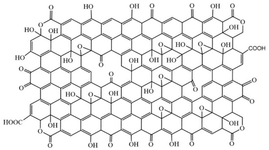 Proposed structure for graphene oxide (GO). Reproduced from ref. [8]. © 2023 by the authors. Licensee MDPI, Basel, Switzerland (CC BY 4.0).