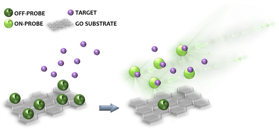 These features have been extensively explored to produce novel sensors and biosensors for applications in many areas, including the environmental [10] and biomedical [11] fields. Biosensors are made of a receptor and a transducer, where the receptor can be a biomolecule that interacts with the targeted analyte and the transducer offers sensing information that transfers the electrical, chemical or optical information into a detectable signal [12,13]. Among other sensing mechanisms, based e.g., on laser desorption/ionization mass spectrometry (LDI-MS) [14], surface-enhanced Raman spectroscopy (SERS) [15], and electrochemistry [16], fluorescence-based GO biosensors gained increasing attention thanks to the ability of GO to quench the fluorescence of labeling dyes and fluorophores of biosensing probes [17]. Basically, fluorescent probes can be adsorbed on the surface of GO, which significantly quenches their fluorescence; in the presence of the target molecule, the probe leaves the GO surface due to the establishment of strong probe–target interactions and the fluorescence signal is recovered (switch-ON effect), revealing the presence of the target molecule (Figure 2). This work intends to review the latest advances in the application of fluorescence quenching GO-based sensing systems for the detection of viruses, bacteria, and cancer cells, for biomedical purposes.