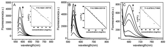 Steady-state fluorescence spectra of dyes (10−5 mg/mL in water) in presence of different concentrations of GO as a quencher (curves a–f: a: lowest GO concentration, f: highest GO concentration). (A) rhodamine B, (B) eosin, (C) methylene blue. (i–iii) linear relationship between the corresponding dye fluorescence (a.u.) and GO concentration (mg/mL). Reproduced with permission from ref. [17]. © 2023 Elsevier B.V.