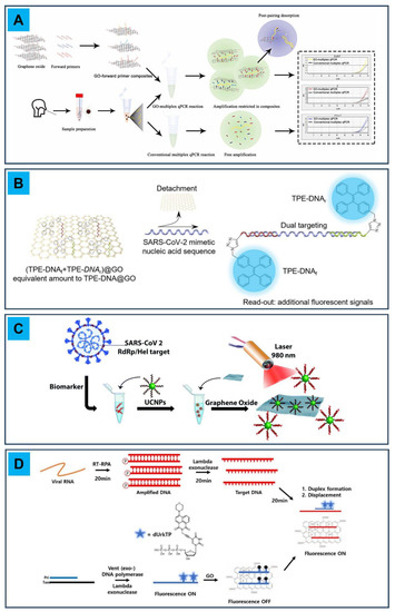 Early detection of viral infections is highly desirable, since it allows for better treatment evaluation and for a prompt, longer therapeutic intervention, thus reducing the likelihood of poor prognoses. This need has been boosted by the recent COVID-19 pandemic event that led to a great demand for the early diagnosis of SARS-CoV-2 infections [49]. Conventional diagnostic systems for viruses rely on cultures, enzyme-linked immunosorbent assay (ELISA) tests on specific immunoglobulins, real-time polymerase chain reaction (PCR), etc. However, improvements in the early diagnosis are still sought in order to offer timely intervention. Virus sensors should comply with selectivity, specificity, sensitivity, stability and cost requirements to be produced on a mass scale and to improve the healthcare chain from disease detection to treatment. Recently, GO has been explored as a potential element in the detection of viral pathogens [50,51]. Its surface can adsorb single-stranded DNA and RNA thanks to π-stacking interactions and hydrogen bonds that can form between the aromatic moieties of the exposed nucleotides and the honeycomb structure of GO. Additionally, GO only rarely adsorbs folded or double-stranded DNA, as showed by ss- and ds-DNA different adsorption kinetics [52]. This ability to adsorb ss-DNA has been exploited to decrease the detection limit of multiplex qPCR analyses for the detection of viral strands such as SARS-CoV-2 [53], according to the principle schematized in Figure 5A. In this context, a highly sequence-specific biosensor was created by Zhang et al. for the point-of-care, one-step detection of SARS-CoV-2-specific nucleic acid sequences (ORF1ab or N genes) exploiting the combination of aggregation-induced emission luminogen (AIEgen)-labeled oligonucleotide probes with GO nanostructures [54]. Tetraphenylethylene (TPE), a well-known AIEgen, is labeled with DNA and immobilized on the surface of GO nanosheets. Viral nucleic acid detection is performed thanks to a dual “turn-on” mechanism: initially, fluorescence recovery is due to the dissociation of the AIEgen from the GO nanosheet surface in the presence of the target viral nucleic acid; secondly, an enhancement of the AIE-based fluorescent signal is obtained, thanks to the formation of a nucleic acid couple (from single to double strand), able to hinder the intramolecular rotation of the luminogen. This mechanism allows for quick (<1 h) and amplification-free virus detection down to picomolar concentration, thus giving an appreciable preliminary sample screening before PCR confirmation and quantification measurements. Another PCR-free strategy was proposed by Alexaki et al., who developed an oligonucleotide sensor using upconversion nanoparticles (UCNPs) and GO [55]. UCNPs are nanometric particles able to absorb two low-energy photons and to convert them into a high-energy emitted photon, producing an anti-Stokes shift. The proposed UNPCs are composed of a sensitizer ion (Yb3+) and an activator ion (Er3+) embedded in a lattice (NaYF4) whose surface is decorated with synthetic oligonucleotides. In the presence of GO, the oligonucleotide aromatic moieties establish π–π interactions with the GO surface, leading to fluorescence quenching of the particles. When the SARS-CoV-2 oligonucleotide target is present, hybridization of bases takes place, the particles no longer adsorb on the GO surface and the fluorescence signal is recovered. This system proved valid down to femtomolar concentrations of the target. Unlike PCR, which requires time and equipment for gene amplification, isothermal amplification such as recombinase polymerase amplification (RPA) is suitable as a point-of-care detection method, since it requires only about 20 min to sufficiently amplify a target gene for detection. For the detection of the N gene of SARS-CoV-2, Choi et al. combined RPA with a turn-on fluorescent rkDNA-GO probe system in order to improve selectivity, thanks to the probe, and sensitivity, thanks to the amplification step, thus overcoming the limitations of the two individual techniques [56]. This method allowed for the quick (about 1 h) and femtomolar-sensitive detection of the target, a limit further improvable with longer (about 1.6 h) amplification times. The cited GO-based sensors for SARS-CoV-2 detection are schematized in Figure 5.