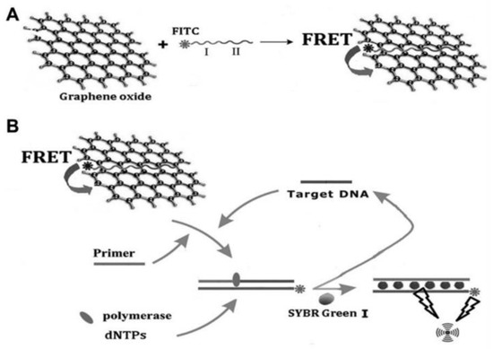 Ning et al. designed a novel fluorescent biosensor by combining Klenow fragment (KF)-assisted target recycling amplification with synchronous fluorescence analysis for the detection of MRSA carrying the mecA gene [79]. In the absence of the target, the FAM-labeled probe creates π–π interactions with the surface of GO, and its fluorescence is quenched by GO as a result of FRET. As a consequence of the specific recognition between complementary nucleic acid sequences, when the target DNA and primer are present, the probe leaves the GO surface. After the addition of dNTPs and KF, the polymerization reaction that renovates the target sequence for the next round starts, producing a large amount of dsDNA. Afterwards, SYBR Green I is added, and forms a strongly fluorescent DNA-SYBR Green I duplex structure (Figure 6). When target DNA is detected by synchronous fluorescence analysis, since the fluorescence emission of FAM and SYBR Green I completely overlap, fluorescence is significantly enhanced.