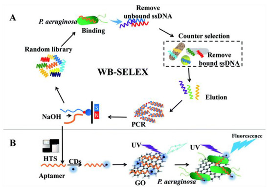 A schematic representation for the development of the fluorescence assay to detect P. aeruginosa. (A) Whole-bacteria SELEX (WB-SLEX) for selecting aptamer candidates for P. aeruginosa. High-throughput sequencing (HTS) was performed for the recognition of aptamer candidates. (B) Working principle of aptamer-carbon dots (CDs)/graphene oxide (GO) system for fluorescence detection of P. aeruginosa. Adapted with permission from Ref. [89]. © Royal Society of Chemistry 2018 (CC BY NC 3.0).