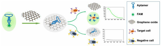 The high potential of GO fluorescence quenching for cancer diagnostic and therapy has been highlighted over the past few years by an increasing number of articles. In this context, the ability of GO to easily bind single-stranded DNA/RNA fragments (aptamers) through hydrophobic π–π stacking interactions has been often exploited [99]. Indeed, thanks to their small size, high chemical stability, and low immunogenicity, aptamers can bind to their targets with high affinity and specificity. A recent study demonstrated that a biosensor based on fluorescence quenching through FRET can be developed by combining GO with carboxyfluorescein-labeled Sgc8 aptamer (FAM-apt) [100]. This GO-based fluorescent aptasensor was suitable for detecting human acute leukemic lymphoblast cells (CCRF-CEM) in a wide range of concentrations, from 1 × 102 to 1 × 107 cells/mL, with a LOD of 10 cells/mL. CCRF-CEM cells were also detected in the range from 50 to 105 cells by employing a label-free and GO-based aptasensor exploiting cell-triggered cyclic enzymatic signal amplification [101]. Fluorescence analysis demonstrated that this approach enables a detection limit approximately 20 times lower than the LOD of conventional fluorescence aptamer-based sensors without amplification.