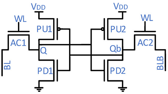 Figure 3 shows a conventional 6T-SRAM cell; it consists of six transistors: pull-up (PU), pull-down (PD), and access (AC). The 6T-SRAM cell operates in either of three modes: hold, read, and write. In the hold mode, both access transistors are off, hence the cell retains the internal nodes’ values. In the read operation, the access transistors activation through the wordline (WL) connects the internal nodes (Q and Qb) to the precharged bitlines (BLs). Then, the SRAM cell puts stored values onto the BLs. The write operation is the inverse of the read operation, i.e., a write driver through the BLs puts value onto the internal nodes. The 6T-SRAM cell transistors’ strength differs to ensure a successful operation. The PD transistors should be the strongest ones, while the AC and PU transistors come in second and third place, respectively, in the strength hierarchy. The pull ratio (the PU-to-AC transistors strength) and cell ratio (the PD-to-AC transistors strength) adjustment tunes the read and write performance of an SRAM cell.