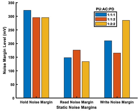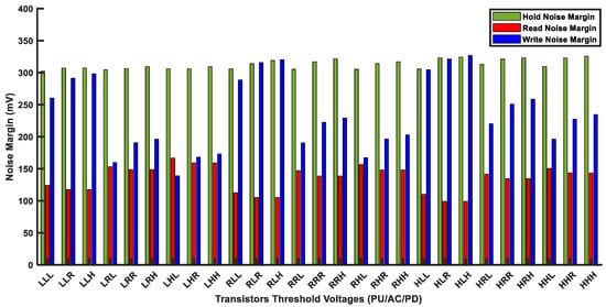 In order to analyze Vth effects, we implemented the multithreshold voltage-based (multi-Vth) HD FinFET 6T-SRAM cell. As the FinFET 6T-SRAM cell has 6 transistors, 27 multithreshold SRAM cell combinations are possible by using low-, standard-, and high-threshold voltage FinFET models. As each FinFET model name suggests, the Vth voltage is either low, standard, or high in comparison with one another. Figure 11 shows noise margin measurement under threshold voltage variations. Three alphabets (on the x-axis) for each combination are in order of pull-up, access, and pull-down transistor threshold voltage strengths, respectively. The H, R, and L in Figure 11 denote high-Vth, regular-Vth, and low-Vth voltages, respectively. For example, the RLH combination represents pull-up transistors with regular Vth (R), access transistors with low Vth (L), and pull-down transistors with high Vth (H) strength. We simulated the FinFET 6T-SRAM cell array with a size of 32KB designed with 12 nm FinFET process technology. The noise margin measurements are taken using the butterfly curve method [6].