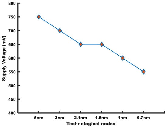 Reduction in supply voltage as a result of technology scaling (IRDS 2022 guidelines).