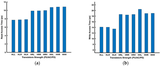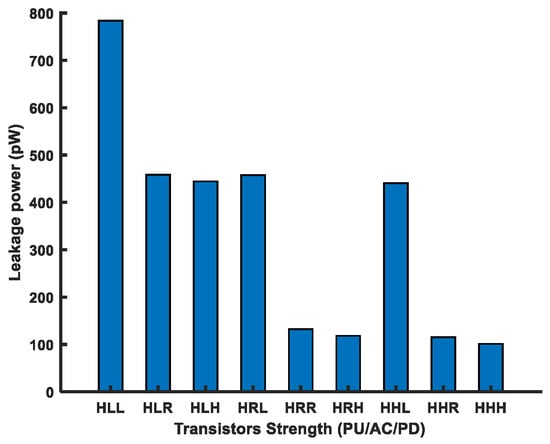 As the PU transistor should be the weakest among the other two transistors in a FinFET 6T-SRAM cell, we used the PU transistor with the highest (H) Vth and varied the remaining two transistors’ strengths, i.e., the AC and PD, to analyze cell performance. Figure 12 shows the leakage power for the above-mentioned transistor combinations in the FinFET 6T-SRAM cell. Overall, the leakage power consumption has an inverse relationship with the threshold voltage.