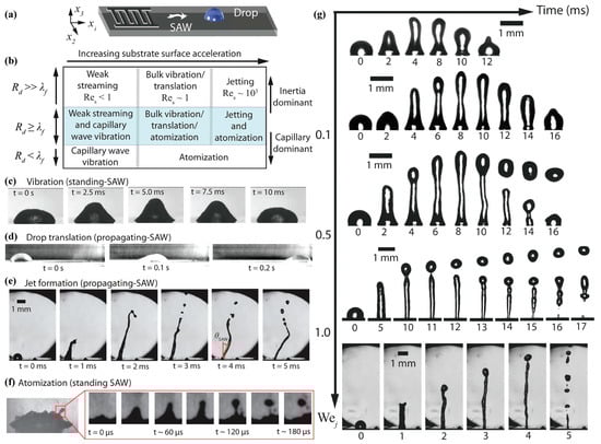 (a) Illustration of the SAW device on which a deionized water drop is placed in the propagation pathway of the SAW. (b) Summary of the different drop behaviors observed as a function of the LSAW wavelength and the drop size: (c) drop vibration, (d) translation, (e) jetting at the Rayleigh angle, and (f) atomization due to SAW. (g) The transition of droplet jetting by increased the jet Weber number . Reprinted from Tan et al. [].