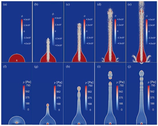 Jangi et al. [] employed the CLSVOF method to simulate the liquid jetting induced by circular surface acoustic waves (CSAWs) on a ZnO film. Due to the in-plane isotropy of the ZnO film, sharp cylindrical liquid columns were generated by the ZnO/Si CSAWs device when subjected to acoustic energy from various directions within the plane. The following figures present the CLSVOF simulation results for the first 8 ms. Figure 2a–e displays the temporal evolution of the level set function , which can be applied to find out the evolution of the liquid–gas interface. Velocity vectors confirm that the jet is the result of a strong vertical momentum flow induced by circular focusing of the SAW. Figure 2f–j shows snapshots of the temporal variation in pressure distribution of the equal area = 0.5 interface. The deformation of the droplet surface also drives the internal pressure, which is a function of the free surface curvature. High-pressure areas occur where the curvature at the jet tip is large while low-pressure areas occur where the interface curvature is reduced throughout the entire jet flow. These high- and low-pressure regions lead to local deformation and instability throughout the jet, resulting in the so-called Plateau–Rayleigh instability.
