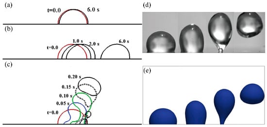 Burnside et al. [] conducted LBM simulations to investigate the effect of different gas–liquid viscosity ratios (5, 15, 20) on jetting separation time. The research finds that an increase in the viscosity ratio leads to a proportional increase of the duration time for the droplet to expel from the substrate surface. This phenomenon can be explained by the deceleration of energy transmission caused by the viscosity’s increase of either the gas phase or the gas–liquid interface, consequently decelerating the movement of the interface along the Rayleigh angle.