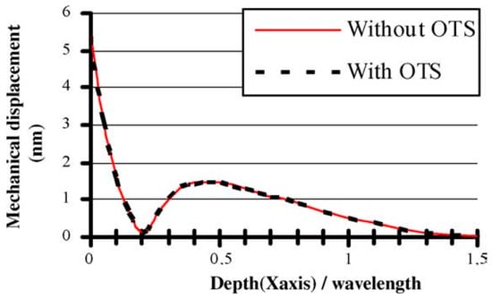 The direction of and the radiation of the LSAWs share the same angle. Furthermore, it has been observed that the amplitude of surface acoustic waves is directly proportional to the input radio frequency (RF) power and can be characterized in terms of the input RF power and wavelength using the following equation [,]: